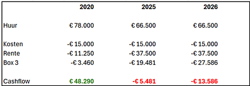 Een voorbeeld uit de praktijk: een klant heeft vijf appartementen in de verhuur en wil zijn lening van € 750.000 verlengen. Hij wil weten wat de impact is op zijn cashflow van de gestegen rente, de hogere belastingdruk en de huurbeperking. Vergeleken met 2020, toen hij begon, houden we de WOZ-waardes, de huren en onderhoudskosten gelijk. De totale WOZ-waarde van de appartementen is € 1.500.000, de lening € 750.000. De rente was bij afsluiten 1,5 procent en is nu 5 procent. In onze berekening voor 2025 en 2026 hebben we de maximale huurprijsgrens gehanteerd.